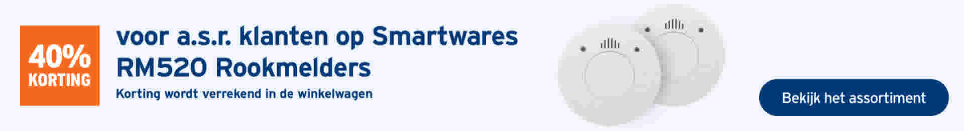 *De klantenkorting van a.s.r. is niet te combineren met andere kortingen of afprijzingen. Het is dus niet mogelijk om als klant korting over korting te krijgen. De korting geldt alleen op de Smartwares Optische Rookmelder RM520 1-pack, 2-pack en 3-pack. Maximaal 1 artikel per klant.