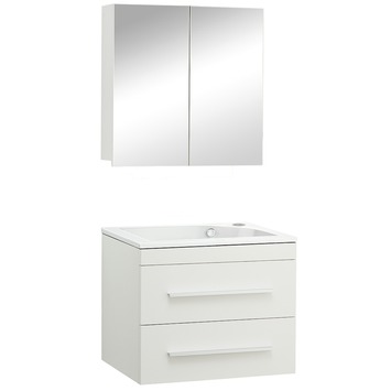 Zoek je een modern en praktisch badmeubel voor jouw badkamer? Deze 60 cm brede Style-badmeubelset rechts mat wit van GAMMA is eigentijds vormgegeven en misstaat in geen enkele badkamer. Het badmeubel is prettig in gebruik dankzij de geleidelijk en stil sluitende laden en spiegeldeuren die zijn uitgevoerd met softclose ladegeleiders en scharnieren. Je sluit en opent de laden met behulp van de aluminium grepen. De badmeubelset van 60 cm breed bestaat uit een onderkast van hoogwaardig MDF, een wastafel met overloop van keramiek en een spiegelkast. Let op: het kraangat van de wastafel bevindt zich aan de rechterkant van het blad.