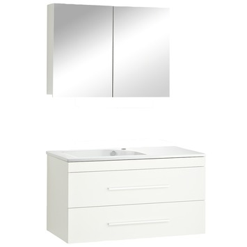 GAMMA's witte Style-badmeubelset rechts is 100 cm breed en geschikt voor iedere badkamer. Het moderne badmeubel matcht dankzij de witte kleur met uiteenlopende badkamerinterieurs. Of je nu een grote of kleine badkamer heeft, dit badkamermeubel van de serie Style met praktische vormgeving past bijna altijd. In de laden en spiegelkast van de badmeubelset vind je genoeg ruimte voor het opbergen van handdoeken en toiletartikelen. De laden en spiegeldeuren zijn bovendien allemaal voorzien van softclose ladegeleiders en scharnieren waardoor ze zacht en geleidelijk sluiten. Doordat het witte badmeubel is gemaakt van hoogwaardig MDF en grepen van aluminium heeft, is het een solide en duurzaam badmeubel. Let op: het kraangat zit aan de rechterkant van het wastafelblad. Deze wastafel is gemaakt van keramiek en heeft een overloop. De witte Style-badmeubelset is daarnaast verkrijgbaar met het kraangat aan de linkerkant van het wastafelblad.