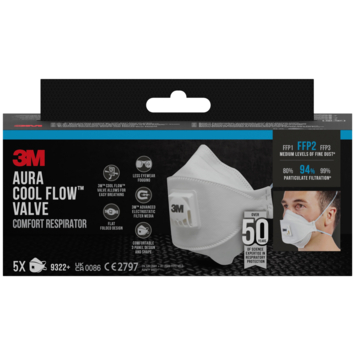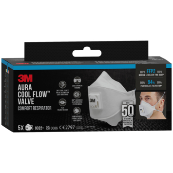 Het 3M™ Aura™ Stofmasker voor handmatig en machinaal schuren 9322+ is ons geventileerde gelaatsmasker met filter dat is voorzien van het Aura™ ontwerp met 3 panelen, een verstelbare neusbeugel, een voorgevormd neuspaneel, kleurgecodeerde hoofdbanden en het 3M™ Cool Flow™ uitademventiel voor comfortabel dragen. Het is FFP2-geclassificeerd en verkrijgbaar in een verpakking van 5 stuks.