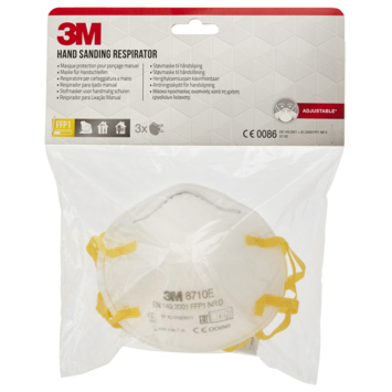 Het 3M™ Stofmasker voor handmatig schuren 8710E is ons gelaatsmasker met filter met een robuuste vormvaste schaal, een verstelbare neusbeugel en kleurgecodeerde hoofdbanden voor comfortabele bescherming. Het is FFP1-geclassificeerd en verkrijgbaar in een verpakking van 3 stuks.
