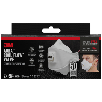 Het 3M™ Aura™ Stofmasker voor isolatiemateriaal en hardhout 9332+ is ons gelaatsmasker met filter dat is voorzien van het Aura™ ontwerp met 3 panelen, een verstelbare neusbeugel, een voorgevormd neuspaneel, kleurgecodeerde rode hoofdbanden en het 3M™ Cool Flow™ uitademventiel voor comfortabel dragen. Het is FFP3-geclassificeerd en verkrijgbaar in een verpakking van 2 stuks.