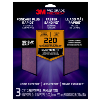 Gebruik 3M Pro Grade Precision Schuurvellen Korrel 220 fijn 3 stuks voor sneller en beter schuren. De combinatie van een NO-SLIP GRIP™-achterzijde en premium mineraaltechnologie die wordt gebruikt in CUBITRON™ II industriële schuurmiddelen zorgen voor een langere levensduur van het vel. Door deze technologie heb je minder inspanning nodig tijdens het schuren en worden je handen ook minder vermoeid. Deze vellen zijn geschikt voor zowel nat als droog schuren.