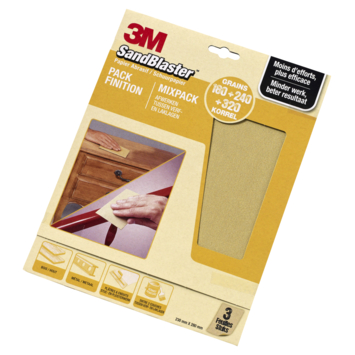 De 3M Sandblaster schuurpapierP320/P240/P180 3 stuks is een mixpack met drie vellen schuurpapier met een fijne korrel in verschillende gradaties. Allen zijn ze geschikt voor het afwerken tussen verflagen. Geschikt voor hout, metaal en stuc- en pleisterwerk.