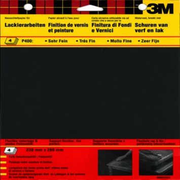De 3M schuurpapier assortiment K240, P400, K600 zwart is een mixpack van vier vellen fijn schuurpapier voor lichte verf- en lak mattering tussen twee verflagen om een goede hechting van de laatste laag te verzekeren. Het schuurpapier is watervast en kan dus ook voor nat schuren gebruikt worden. Geschikt voor metaal, natuursteen en kunststof.
