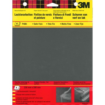 De 3M schuurpapier zeer fijn K400 zwart 4 stuks zijn vier vellen fijn schuurpapier voor lichte verf- en lak mattering tussen twee verflagen om een goede hechting van de laatste laag te verzekeren. Het schuurpapier is watervast en kan dus ook voor nat schuren gebruikt worden. Geschikt voor metaal, natuursteen en kunststof.