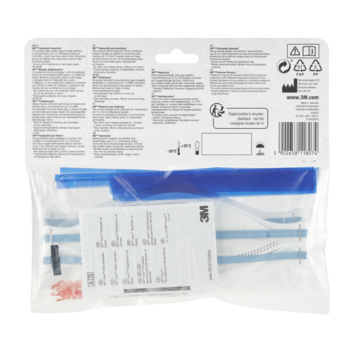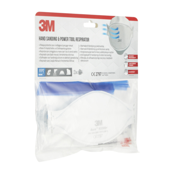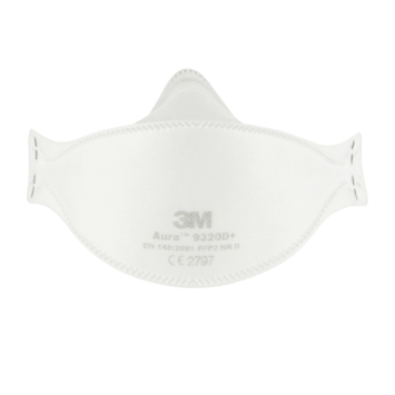 Het 3M™ Aura™ Stofmasker voor handmatig en machinaal schuren 9320D+ met Aura™-ontwerp met drie panelen, instelbare neusklem, voorgevormd neuspaneel, kleurgecodeerde hoofdbanden. FFP2-geclassificeerd en verkrijgbaar in een verpakking van 3 stuks.