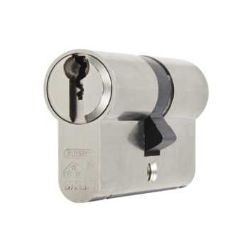 De 3 sterren SKG cilinder van ABUS heeft een gevarenfunctie: aan de buitenzijde bedienbaar als aan de binnenzijde een sleutel in steekt. De cilinder heeft 6 sluitstiften per zijde en een goede boorbeveiliging: 8 hardstalen elementen per zijde. Geleverd met 3 sleutels met langere hals t.b.v. dikte van veiligheidsbeslag.