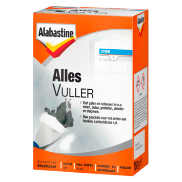 Met de Albastine Allesvuller (750 gr en 2 kg) in poedervorm kunt u gaten en scheuren tot 5 cm diep in één keer vullen in binnen- en buitenmuren. Daarnaast kunt u dit vulmiddel ook gebruiken voor het zetten van hoeken en contactdozen. Met de Allesvuller kunt u zelfs gaten en scheuren in vochtige ruimtes en kelders vullen. De Allesvuller droogt wit op en is schroef-, spijker- en boorvast. Door de uitstekende hechting op steen, pleister, baksteen en beton is de Allesvuller van Albastine het ideale vulmiddel voor allerlei ondergronden.