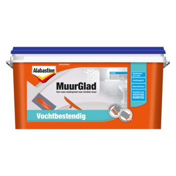 Alabastine MuurGlad vochtbestendig 5 liter egaliseert eenvoudig tegels of beschadigde wanden in vochtige ruimtes zoals de badkamer. Na het aanbrengen van deze kant-en-klare pasta is uw muur klaar om te schilderen, tegelen of behangen. Ook geschikt voor wanden met vochtdoorslag en buiten. Aan te brengen met de Alabastine Spaan en Strijker.