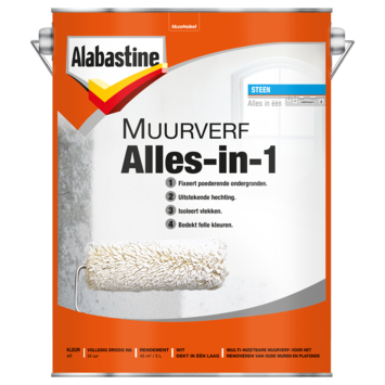 Alabastine muurverf Alles-in-1 wit mat 5 liter voorkomt afbladderen en loslaten van verf en bedekt blijvend alle hardnekkige vlekken. De verf is ideaal voor het renoveren van oude muren en plafonds en is te gebruiken op poederende lagen, dunne lagen veegvast en witkalk, oude muurverflagen en oude ondergronden. De Alabastine Alles-in-1 dekt in 1 laag en heeft een helder witte matte kleur. De muurverf is gebruiksklaar en hoeft niet meer verdund te worden.