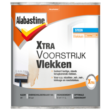 Alabastine voorstrijk voor vlekken isoleert blijvend lastige en steeds terugkerende vlekken. Hierbij kunt u denken aan onder andere nicotine-, vet-, roest-, roet-, ballpoint-, potlood-, lekkage-, teer-, wijn-, koffie- en waskrijtvlekken. De inhoudsmaat is 1 liter.