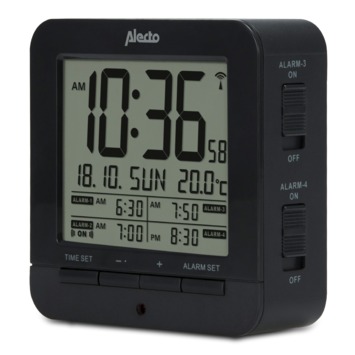 Alecto AK-20 wekker met thermometer en weergave binnentemperatuur is verkrijgbaar in de kleur: zwart. Op het beeldscherm van deze wekker kun je veel informatie aflezen. Te beginnen met de tijd, aangegeven in uren, minuten en seconden; tot op de milliseconde nauwkeurig dankzij de DCF-gestuurde klok. Daaronder staan de datum, dag en temperatuur vermeld. En daaronder de wektijden die je hebt ingesteld.