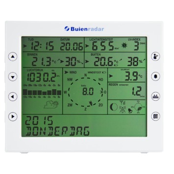 Een draadloos thuis weerstation Met het BR-1800 thuis weerstation van Buienradar wordt professionele weermeting voor elke weerenthousiateling mogelijk. Hij bestaat uit een mast met verschillende sensoren voor buiten (de buitenunit) en een prachtig meetdisplay voor binnen. De draadloze buitenunit is compleet: hij komt met een regenmeter, windsnelheidsmeter, windrichtingsensor, temperatuursensor en vochtigheidssensor. De buienmast wordt gevoed door een zonnepaneel. Dat is niet alleen duurzaam maar goedkoop bovendien. Alle data over de actuele neerslag, temperatuur, luchtvochtigheid en wind worden draadloos verzonden naar het prachtige grote scherm, en op een geanimeerde manier in beeld gebracht. Zo weet je altijd precies hoe de situatie buiten is. Daarnaast vertelt dit thuis weerstation je ook hoe het met de temperatuur ín huis is gesteld. Ook deze data wordt draadloos naar je display verzonden. Alle voordelen van de BR-1800 op een rij: - Draadloze buitensensoren zijn op een robuuste mast aangebracht - Zonnepaneel voedt de mastsensoren - Eenvoudig aan te sluiten en in gebruik te nemen - Levert uitgebreide lokale weersinformatie Intern geheugen voor 660.000 metingen De BR-1800 kan de data van maar liefst 660.000 metingen opslaan. Zo bouw je aan een feilloos logboek met weergegevens van jouw eigen locatie. Thuis weerstation BR-1800: product van Nederlandse topbedrijven Het draadloos weerstation BR-1800 is een product dat is ontwikkeld in een unieke samenwerking van Alecto en Buienradar. Buienradar is dé maatstaf in meteorologische data. Wie wil weten wat de voorspellingen zijn kijkt altijd even op Buienradar.nl. Alecto is in de afgelopen decennia bekend geworden als ontwikkelaar van slimme en betaalbare consumentenelektronica. Alecto bedenkt oplossingen die het leven praktischer, comfortabeler en veiliger maken. Het thuis weerstation BR-1800 is daarom een topproduct van Nederlandse makelij, waarin de krachten van beide ontwikkelaars samenkomen. Met Buienradar en Alecto kies je voor een doordacht en gebruiksvriendelijk product van hoge kwaliteit.