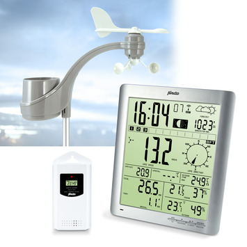 Dit luxe digitale weerstation WS-3800 met buitensensor van Alecto heeft een extra groot scherm en een regen- en windmeter. De WS-3800 start direct met het signaal van de buitensensor, als de beiden units zijn gevuld met 1,5 Volt AA-batterijen. De buitensensor is met een draad verbonden aan de regen- en windmeter en heeft ook een klein display. Het grote scherm van het draadloze weerstation geeft zoveel informatie: de tijd, datum, binnen- en buitentemperatuur, luchtdruk en windrichting. Maar ook de luchtvochtigheid binnen en buiten, de maanstand en de weersvoorspelling. Aan de hand van de luchtdruk berekent het weerstation het weer voor de komende 12-24 uur. De Alecto WS-3800 is een zeer uitgebreid weerstation, die je alles over het weer vertelt. Technische specificaties • Meet gevoels-, binnen- en buitentemperatuur • Registreert neerslag en windsnelheid • Meet luchtdruk en windrichting • Wekker met snooze functie • Maanstand-weergave • Geanimeerde weersvoorspelling 12-24 uur • Meet luchtvochtigheid binnen en buiten • Altijd de juiste tijd (DCF-gestuurde klok) • Kleurendisplay met weergave van tijd, dag en datum • Displaykleur instelbaar of temperatuurafhankelijk Tips & tricks • Het weerstation niet in direct zonlicht plaatsen en verwijder objecten die warmte (kunnen) uitstralen (lampen, verwarmingen, e.d.). • Om de regen- en windmeter zo nauwkeurig mogelijk te laten werken, moet de regen- en windmeter zo exact mogelijk horizontaal staan. • Om aan te kunnen geven uit welke richting de wind vandaan komt, moet de regen- en windmeter op het Noorden gericht worden. • De buitensensor is weliswaar geschikt voor plaatsing buiten maar is niet waterdicht. Plaats deze unit dus op een voor regen en wind beschutte plaats. • De afstand tussen het weerstation en de buitensensor mag niet meer dan 30 meter bedragen. • Het weerstation en de buitensensor werken op in totaal zes AA 1,5 Volt batterijen die niet worden meegeleverd. • Plaats het weerstation, voor een goede ontvangst van de radio-gestuurde tijdsignalen, niet naast grote metalen oppervlakken of zware elektrische apparaten zoals een koelkast of wasmachine. Afmetingen • Afmetingen weerstation: 210 x 240 x 25 mm (bxhxl) • Schermgrootte weerstation: 187 x 40 mm (bxh) • Afmetingen buitensensor: 70 x 135 x 2 5mm (bxhxl) Wat zit er in de doos? • Weerstation WS-3800 • Regen- en windmeter • Buitensensor • Montage-onderdelen • Nederlandse handleiding