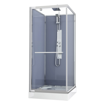 Met deze complete douchecabine Anapurna van Allibert haal je in één keer alles in huis om heerlijk te genieten van een ontspannende douche. Wel zo gemakkelijk! Dit hoekmodel van 90 x 90 cm heeft een luxe en moderne uitstraling. De achterwanden zijn in het grijs uitgevoerd en de cabine is afgewerkt met een mat aluminium profiel. Met een royale douchekolom, hydromassagestralen en een in 3 standen verstelbare handdouche pas je jouw douchesessies snel en eenvoudig aan naar jouw specifieke wensen. Dankzij de speciale antislip voorziening stap je veilig via de draaideur de cabine in en uit. Op het veiligheidsglas is een special coating aangebracht tegen kalk en zeepresten. Hierdoor maak je de wanden gemakkelijk schoon en blijft jouw douchecabine als nieuw!