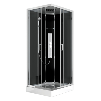 Met de complete douchecabine Gipsy van Allibert heb je alles in één keer geregeld voor een ontspannende douche. Geen gedoe meer! De cabine van 90 x 90 cm heeft een moderne en luxe uitstraling. De achterzijde is uitgevoerd in het zwart en het geheel is afgewerkt met strakke glanzende aluminium profielen. Met een ruime hoofddouche, hydromassagestralen en een verstelbare handdouche in 3 standen, kun je jouw douche-ervaring volledig aanpassen naar jouw wensen. De handige schuifdeur bespaart ruimte en is ideaal voor mensen met een kleinere badkamer die toch van maximaal douchecomfort willen genieten. De antislipfunctie op de vloer voorkomt uitglijden, terwijl de coating op het glas tegen vuil en kalkaanslag beschermt. Zo maak je de wanden makkelijk schoon en blijft jouw douchecabine er als nieuw uitzien.