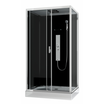 Met de complete douchecabine Gipsy van Allibert heb je alles in één keer geregeld voor een ontspannende douche. Geen gedoe meer! Dit extra ruime wandmodel van 80 x 120 cm heeft een moderne en luxe uitstraling. De achterzijde is uitgevoerd in het zwart en het geheel is afgewerkt met strakke glanzende aluminium profielen. Met een ruime hoofddouche, hydromassagestralen en een verstelbare handdouche in 3 standen, kun je jouw douche-ervaring volledig aanpassen naar jouw wensen. De handige schuifdeur bespaart ruimte en is ideaal voor mensen met een kleinere badkamer die toch van maximaal douchecomfort willen genieten. De antislipfunctie op de vloer voorkomt uitglijden, terwijl de coating op het glas tegen vuil en kalkaanslag beschermt. Zo maak je de wanden makkelijk schoon en blijft jouw douchecabine er als nieuw uitzien.