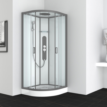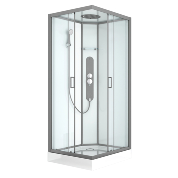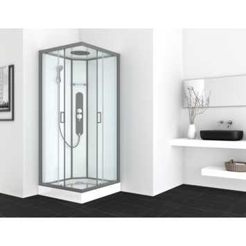Met de complete douchecabine Uyuni van Allibert heb je alles in één keer geregeld voor een ontspannende douche. Geen gedoe meer! Dit model van 90 x 90 cm met hoekinstap heeft een moderne en minimalistische uitstraling. De achterwanden zijn van wit veiligheidsglas en het profiel is vervaardigd uit verchroomd aluminium. Met een hoofddouche in het plafond, hydromassagestralen en een verstelbare handdouche in 3 standen, kun je jouw douche-ervaring volledig aanpassen naar jouw wensen. De dubbele schuifdeur bespaart ruimte en is ideaal voor mensen met een kleinere badkamer die toch van maximaal douchecomfort willen genieten. De antislipvoorziening op de vloer voorkomt uitglijden, terwijl de coating op het glas tegen vuil en kalkaanslag beschermt. Zo maak je de wanden makkelijk schoon en blijft jouw douchecabine er als nieuw uitzien.