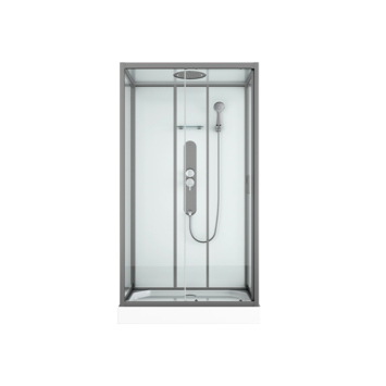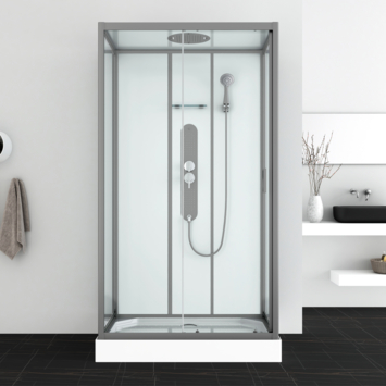 Met de complete douchecabine Uyuni van Allibert heb je alles in één keer geregeld voor een ontspannende douche. Geen gedoe meer! Dit extra ruime wandmodel van 80 x 120 cm heeft een moderne en minimalistische uitstraling. De achterwand bestaat uit wit veiligheidsglas en het profiel is vervaardigd uit verchroomd aluminium. Met een ruime hoofddouche, hydromassagestralen en een verstelbare handdouche in 3 standen, kun je jouw douche-ervaring volledig aanpassen naar jouw wensen. De handige schuifdeur bespaart ruimte en is ideaal voor mensen met een kleinere badkamer die toch van maximaal douchecomfort willen genieten. De antislipvoorziening op de vloer voorkomt uitglijden, terwijl de coating op het glas tegen vuil en kalkaanslag beschermt. Zo maak je de wanden makkelijk schoon en blijft jouw douchecabine er als nieuw uitzien.