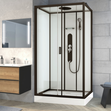 Met de complete douchecabine Uyuni van Allibert heb je alles in één keer geregeld voor een ontspannende douche. Geen gedoe meer! De extra ruime douchecel van 80 x 120 cm heeft een moderne en minimalistische uitstraling. De achterwanden zijn van wit veiligheidsglas en het geheel is afgewerkt met strakke matzwarte aluminium profielen. Met een ruime hoofddouche, hydromassagestralen en een verstelbare handdouche in 3 standen, kun je jouw douche-ervaring volledig aanpassen naar jouw wensen. De handige schuifdeur bespaart ruimte en is ideaal voor mensen met een kleinere badkamer die toch van maximaal douchecomfort willen genieten. De antislipvoorziening op de vloer voorkomt uitglijden, terwijl de coating op het glas tegen vuil en kalkaanslag beschermt. Zo maak je de wanden makkelijk schoon en blijft jouw douchecabine er als nieuw uitzien.