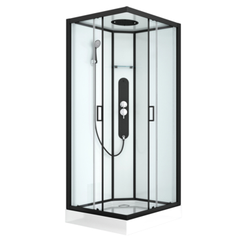 Met de complete douchecabine Uyuni van Allibert heb je alles in één keer geregeld voor een ontspannende douche. Geen gedoe meer! Dit hoekmodel van 90 x 90 cm heeft een moderne en minimalistische uitstraling. De achterwanden zijn van wit veiligheidsglas en het geheel is afgewerkt met strakke matzwarte aluminium profielen. Met een ruime hoofddouche, hydromassagestralen en een verstelbare handdouche in 3 standen, kun je jouw douche-ervaring volledig aanpassen naar jouw wensen. De handige schuifdeur bespaart ruimte en is ideaal voor mensen met een kleinere badkamer die toch van maximaal douchecomfort willen genieten. De antislipvoorziening op de vloer voorkomt uitglijden, terwijl de coating op het glas tegen vuil en kalkaanslag beschermt. Zo maak je de wanden makkelijk schoon en blijft jouw douchecabine er als nieuw uitzien.