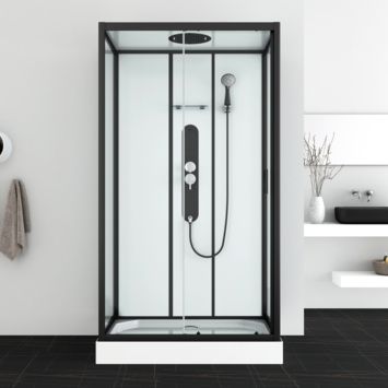 Met de complete douchecabine Uyuni van Allibert heb je alles in één keer geregeld voor een ontspannende douche. Geen gedoe meer! Dit extra ruime wandmodel van 80 x 120 cm heeft een moderne en minimalistische uitstraling. De achterwand is van wit veiligheidsglas en het geheel is afgewerkt met strakke matzwarte aluminium profielen. Met een ruime hoofddouche, hydromassagestralen en een verstelbare handdouche in 3 standen, kun je jouw douche-ervaring volledig aanpassen naar jouw wensen. De handige schuifdeur bespaart ruimte en is ideaal voor mensen met een kleinere badkamer die toch van maximaal douchecomfort willen genieten. De antislipvoorziening op de vloer voorkomt uitglijden, terwijl de coating op het glas tegen vuil en kalkaanslag beschermt. Zo maak je de wanden makkelijk schoon en blijft jouw douchecabine er als nieuw uitzien.