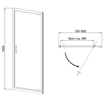 Het glas is omlijst met aluminium profielen, die je aan de muur monteert. De zwaaideur heeft een afmeting van 185 cm hoog en 80 cm breed en is linksdraaiend (de scharnieren zijn aan de linkerzijde geplaatst).