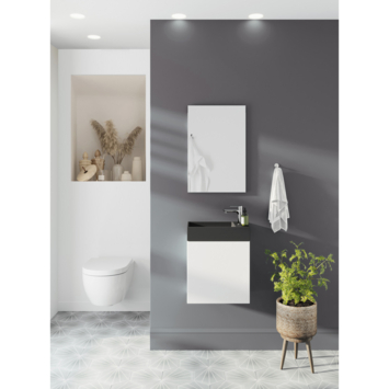 Het Allibert fonteinmeubel Java Pack mat wit is een fonteinmeubel om op te hangen in je badkamer of toilet. Het is 48,6cm hoog, 40,2cm breed en 25,1 cm diep en heeft de houten kleur mat wit. Dit meubel heeft een zwarte wasbak van polybeton, dat is onderhoudsvriendelijk en strak afgewerkt. De onderkast is gemaakt van MDF een heeft één greeploze deur. De scharnieren van de deur zijn omkeerbaar. Hierdoor kun je zelf kiezen of de meubel langs de linkerkant of langs de rechterkant open gaat. Je kiest wat er in jouw toilet het best past. Het fonteinmeubel wordt geleverd met bevestigingsmateriaal. De kraan en sifon worden niet meegeleverd en kan je zelf nog kiezen. Liever een andere kleur? Het Allibert fonteinmeubel Java Pack is verkrijgbaar in 3 kleuren. Dit meubel heeft 2 jaar garantie.