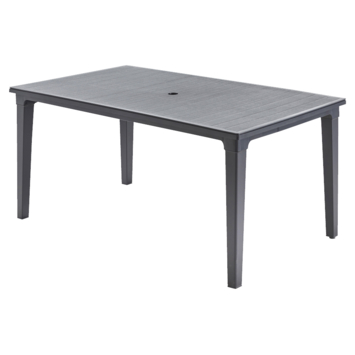 Wil je een makkelijk schoon te maken tafel voor in je tuin? Dan zit je met de All tafel Futura grafiet helemaal goed. Deze tuintafel is gemaakt van kunststof en is daarom licht van gewicht, eenvoudig schoon te maken en weersbestendig. De tafel heeft een stijlvolle en strakke look en dankzij de afwerking van het tafelblad, lijkt de structuur op die van houten latten. In het tafelblad zit een parasolgat en geeft je de mogelijkheid er een parasol in te steken, zodat je eenvoudig schaduw kunt creëren op een zonnige dag. De tafel is 165cm lang en 94cm breed en hierdoor ruim genoeg om met 4 personen comfortabel aan te kunnen eten. Kortom: een simpele en makkelijk te onderhouden tafel.