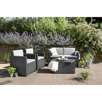 De trendy loungeset bestaat uit twee stoelen, een tweezitsbank en een tafel. De set is gemaakt van zwart wicker, een degelijke kunststofsoort. Dit betekent dat uw tuinmeubelen niet kunnen roesten, rafelen of verweren en dat de set onderhoudsvrij is. Omdat het materiaal weerbestendig is, kunt u de tuinset de hele winter buiten laten staan. De bijgeleverde antracietgrijze kussens zijn niet weerbestendig, maar deze kunt u heel eenvoudig in de tafel opbergen. Die functioneert dan als een kussenbox.