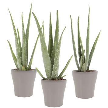 Je zinnen gezet op een Aloë Vera plant? Dan is deze set, van 3 Aloë Vera planten, drie keer zo leuk! De Aloë Vera is een van de meest bekende vetplanten. Met prachtige dikke bladeren die bekend staat om hun helende werking. Gemiddeld zijn de planten zo'n 25 cm hoog en hebben ze een potmaat met een diameter van 12 cm. De Aloë Vera is van zichzelf een erg sterke plant die zeer eenvoudig te verzorgen is. Daarnaast heeft de Aloë Vera ook een luchtzuiverend effect. De bloempot waar deze plant in zit heeft een tijdloze zwarte vormgeving. Daarnaast is de pot ook nog eens waterdicht. Je loopt dus geen risico wanneer je deze op een houten tafel plaatst, met naast de pot gieten als uitzondering natuurlijk. Deze set kun je in de GAMMA webshop ook kopen met een wit- of grijs gekleurde bloempot.