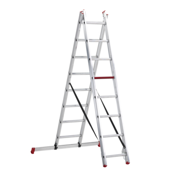 Een trap die je als schuifladder tegen je huis kunt zetten én als A-ladder kunt gebruiken, dat is de Altrex Reformladder All Round 2 x 8 Treeds. Deze ladder is gemaakt van aluminium en daarom licht van gewicht (8.3 kg), je verplaatst hem dus met gemak. Door zijn speciale vorm zit de D-sport stevig in het frame en biedt het je dankzij zijn diepte van 32 mm een breed sta-oppervlak. Je herkent een echte Altrex aan zijn rode sport, die je precies aangeeft tot op welke hoogte je nog verantwoord kan werken. Dankzij de opsteekhaak met veiligheidspal schuift de trap niet zomaar in, wel zo veilig. De maximale draagkracht is 150 kg. Kortom: een goede keuze voor zowel de thuisklusser als de professional.