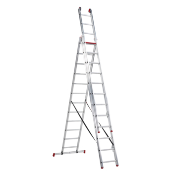 De lichtgewicht Altrex Reformladder All Round 3 x 12 Treeds is te gebruiken als reformladder, schuifladder en opsteekladder. De toprollen op de ladder vergemakkelijken het in- en uitschuiven langs de gevel. Door de reformhaak is de ladder eenvoudig in een A-stand te plaatsen. De opsteekhaak met veiligheidspal voorkomt dat de ladder ongewild inschuift. Dankzij de stabiliteitsbalk heeft u extra stabiliteit. De Altrex Allround reformladder heeft een maximale belasting van 150 kg. De ladder weegt 21.1 kg en heeft een maximale werkhoogte 8,45 m. Vrijstaand heeft de ladder een werkhoogte van 4.80 m, uitgeschoven is de ladder 7.65 m en ingeschoven (om op te bergen) is hij 3.10 m lang. De unieke Rode Sport/Trede zorgt voor een maximale veilige stahoogte. De D-sport heeft een 32 mm diep, horizontaal stavlak wat voor extra stacomfort zorgt. De ladder heeft een garantie van 5 jaar.