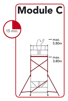 De Altrex Rolsteiger RS Tower 34 module C kan worden gebruikt als uitbreiding op module A en B. Met module C realiseer je een maximale platformhoogte van 380 cm en een werkhoogte van 580 cm. De verschillende modules zijn dankzij een handig klauwmechanisme van schoren in slechts 15 minuten op te bouwen. De frames zijn voorzien van sporten met een antislipprofiel waardoor de steiger veilig kan worden beklommen. Module C bestaat uit een set van 4 kraagbuizen, twee opbouwframes, een platform met luik, 3 diagonaalschoren en 4 driehoeksstabilisatoren. Het totale pakket module C weegt 36,8 kg zodat je de steiger ook gemakkelijk kunt vervoeren.