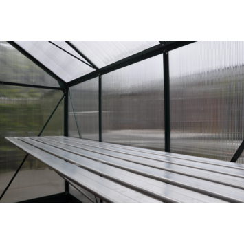 De blanke aluminium Alu Grower 150 vormt een universele kweektafel. Deze tafel heeft een vaste breedtemaat van 62,5 cm en een lengte van 150 cm. De constructie bestaat uit aluminium leggers (6 stuks), dragers en schoren (4 stuks). Een solide verbinding met het kasframe wordt gemaakt met behulp van RVS (hamerkop)bouten en moeren, standaardmaat M6. De kweektafel is in hoogte verstelbaar en kan op een ideale werkhoogte worden ingesteld. De Alu Grower 150 vormt een solide eenheid met de kas en helpt de kweekruimte optimaal te benutten. Deze tafel wordt over 2 staande glasroeden (kasframe) bevestigd en steekt daarmee zowel aan de linker- als rechterzijde voorbij de roede. De gevel- of lengtezijde dient daarom minimaal 3 ruiten breed of lang te zijn.