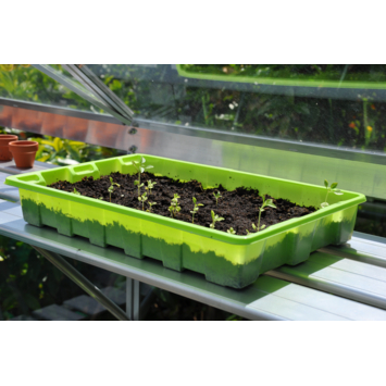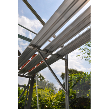Deze blanke aluminium Alu Sower 200 vormt een solide kweekschap en is universeel toepasbaar in zeer veel kasmodellen. Het schap heeft een breedte van 32,5 cm en een lengte van 200 cm. De constructie bestaat uit aluminium leggers (3 stuks), dragers en schoren (4 stuks). Een solide verbinding met het kasframe wordt gemaakt met behulp van RVS (hamerkop)bouten en moeren, standaardmaat M6. Het schap is in hoogte instelbaar waardoor een ideale werkhouding kan worden gerealiseerd. Met behulp van dit schap kan de ruimte in de kas optimaal worden benut. Het schap wordt over 2 staande glasroeden (kasframe) bevestigd en steekt daarmee zowel aan de linker- als rechterzijde voorbij de roede. De gevel- of lengtezijde dient daarom minimaal 3 ruiten breed of lang te zijn.