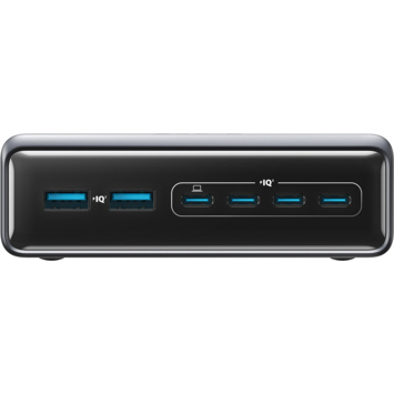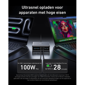 De Anker Prime oplader snelladen tot 200W (6 poorten) is een laadstation waarmee je meerdere apparaten tegelijk kunt opladen. Het totale vermogen is 200 watt, verdeeld over zes aansluitingen. Twee van de USB-C-poorten leveren afzonderlijk tot 100 watt, waardoor je zelfs apparaten met een hoog stroomverbruik, zoals laptops, snel van stroom voorziet. Zo laad je bijvoorbeeld twee 14-inch MacBook Pro’s in nog geen half uur op tot de helft van hun batterijcapaciteit.