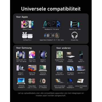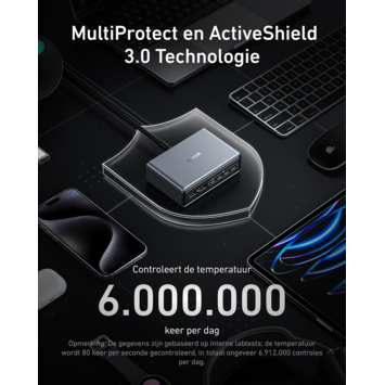 Met zes aansluitpunten heb je één centrale plek om telefoons, tablets, laptops of andere apparaten te laden. Dat scheelt losse adapters en kabels verspreid door huis of kantoor. De ingebouwde MultiProtect- en ActiveShield 3.0-technologie bewaakt continu de temperatuur en spanning tijdens het opladen, zodat je apparaten veilig blijven. In de verpakking zit naast het laadstation ook een netsnoer van 1,5 meter.