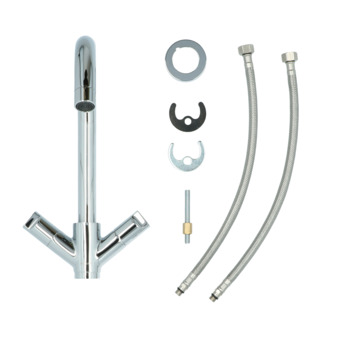 Maak je keuken compleet met de Aqualino Keukenkraan Fortore 2-knops Chroom van GAMMA. Deze fraaie keukenkraan is niet alleen makkelijk te installeren, ook is deze praktisch in gebruik. De keukenkraan is uitgerust met keramische schijven die de draaibaarheid verbeteren. Een ander voordeel hiervan is dat een kraan met keramische schijven nauwelijks onderhoud nodig heeft. De Aqualino-keukenkraan wordt geleverd inclusief bijbehorend aansluitmateriaal. De aansluitmaten van de meegeleverde flexibele slangen zijn 3/8". Op de keukenkraan, die voorzien is van handige 2 draaiknoppen, zit 5 jaar fabrieksgarantie. Niet voor niets combineert de 2-knops keukenkraan Aqualino Fortore een mooi ontwerp met een hoge mate van gebruiksgemak.