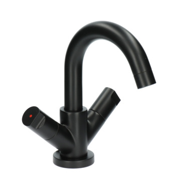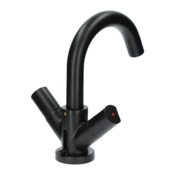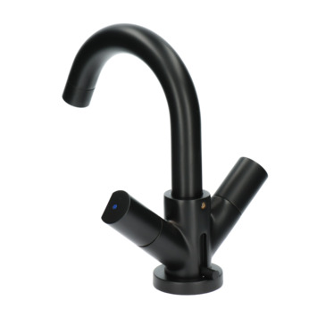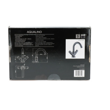 De Aqualino wastafelkraan Fortore 2-knops met waste Zwart bestaat uit een mat zwarte wastafelkraan van 19,5 cm hoog en 16,4 cm diep, een waste met toebehoren en afvoerplug, 2 flexibele aansluitslangen, bevestigingsmateriaal en montagehandleiding. De Fortore wastafelkraan heeft 2 draaiknoppen met keramische schijven, waarmee je de gewenste straalstand en temperatuur soepel en nauwkeurig afstelt. Bovendien vergen kreamische schijven nauwelijks onderhoud. De kraan heeft een draaibare uitloop van 360° waarmee je eenvoudig plaats maakt bij je wastafel. De ronde, c-vormige en hogere uitloop geeft meer ruimte onder de kraan bij bijvoorbeeld het wassen van je handen. Dankzij de waste inrichting bedien je de afvoerplug eenvoudig met een hendel aan de achterzijde van de kraan. Zo hoef je niet meer met je handen in te heet of vies water om het afvoer open te zetten. Aan de anti-kalk perlator hecht kalk zich moeilijk vast en dat veeg je er makkelijk met de hand af. Deze wastafelkraan heeft een rechte strakke vormgeving gecombineerd met robuuste rondingen. De mat zwarte afwerking geeft het geheel een krachtige uitstraling. Gebruik alleen water en een zachte doek om de kraan schoon te maken. Gebruik geen schurend, bijtend, azijnhoudend of agressief schoonmaakmiddel. 5 jaar garantie.
