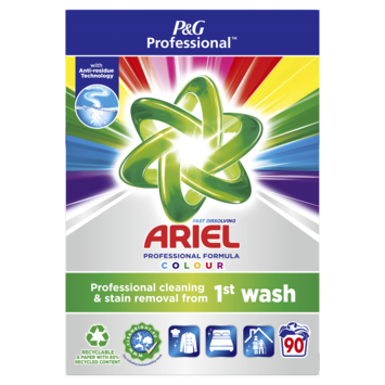 Ariel waspoeder voor gekleurde (20°C - 60°C) was. Voortreffelijk resultaat dankzij de hoge oplosbaarheid. Langdurige frisheid met een heerlijk parfum. Doos van 5,4 kg, goed voor 90 wasbeurten.