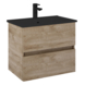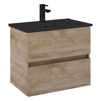 Dit badkamermeubel in eikenkleur met geïntegreerde zwarte keramische wastafel is een praktische oplossing voor dagelijks gebruik. Dankzij het compacte ontwerp neemt het weinig plaats in, terwijl er toch voldoende opbergruimte is. In de diepe lade met softclose-sluiting berg je verzorgingsproducten en handdoeken netjes en overzichtelijk op.