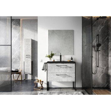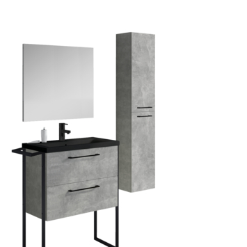 De Atlantic badmeubelset Sienna beton met spiegel en zwarte wastafel 60cm is een hangende set met een chique uitstraling. Dankzij het hangende design creëer je een ruimtelijke look in jouw badkamer. Het meubel is voorzien van 2 soft close laden en een mat zwarte keramische wastafel. Daarnaast is aan deze set een losse spiegel toegevoegd. De set is voorzien van stijlvolle zwarte grepen, wat zorgt voor een chique en industrieel uiterlijk. De set wordt flatpacked geleverd en is eenvoudig te installeren met de meegeleverde bevestigingsmaterialen. Exclusief wastafelkraan. Geef het badmeubel een extra industriële look door de Atlantic Sienna zwarte stalen frames (art. 137942) toe te voegen.