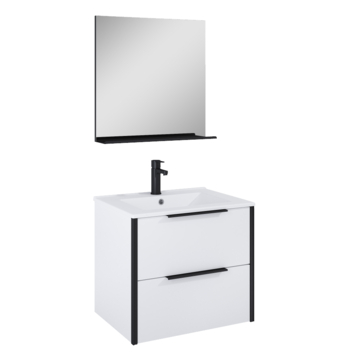 De Atlantic badmeubelset Aria met spiegel en witte wastafel 60cm Mat Wit is een hangende set met een industriele uitstraling. Dankzij het hangende design creëer je een ruimtelijke look in jouw badkamer. Het meubel is voorzien van 2 soft close laden en een mat witte keramische wastafel. Ook zijn er zwarte profielen geplaatst op de randen van het badmeubel voor een extra stoere look. Daarnaast is aan deze set een losse vierkante spiegel met planchet toegevoegd. De set is voorzien van stijlvolle mat zwarte grepen, wat zorgt voor een chique en industrieel uiterlijk. De set wordt flatpacked geleverd en is eenvoudig te installeren met de meegeleverde bevestigingsmaterialen. Exclusief wastafelkraan.