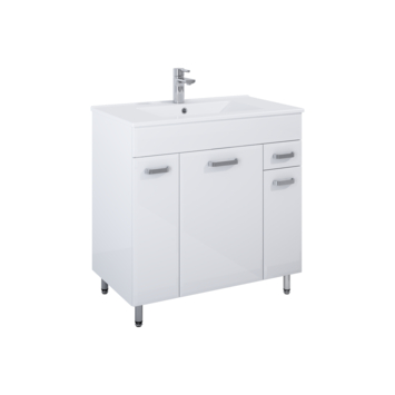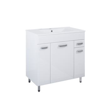 Met het Emin badmeubel van 80 cm en de Kyra wastafel organiseer je je badkamer slim en stijlvol. De drie deuren en één lade bieden overzichtelijke opbergruimte voor handdoeken en verzorgingsproducten, terwijl de pootjes de kast van de vloer tillen en schoonmaken makkelijker maken. De keramische wastafel geeft voldoende werkruimte en heeft aan de muurzijde plek voor dagelijkse essentials. Het meubel is eenvoudig te plaatsen en voelt solide aan, geschikt voor zowel een eerste montage als een update van je badkamer. Dankzij het klassieke witte design past het in elk interieur en behoudt het zijn uitstraling.