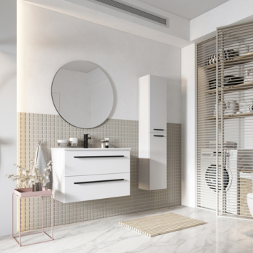 De Atlantic badmeubelset Stella met spiegel en witte wastafel 80cm Mat Wit is een hangende set met een chique uitstraling. Dankzij het hangende design creëer je een ruimtelijke look in jouw badkamer. Het meubel is voorzien van 2 soft close laden en een mat zwarte keramische wastafel. Daarnaast is aan deze set een losse ronde spiegel toegevoegd. De set is voorzien van stijlvolle mat zwarte grepen, wat zorgt voor een chique en industrieel uiterlijk. De set wordt flatpacked geleverd en is eenvoudig te installeren met de meegeleverde bevestigingsmaterialen. Exclusief wastafelkraan.
