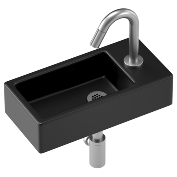 De Atlantic fonteinset Billy is gemaakt van zwart mat keramiek en is ideaal voor de kleine badkamer of toiletruimte. Door deze wasbak in een hoek te plaatsen kun je ruimte besparen, maar hij staat ook prima op een vlakke wand. De fonteinset komt met kraan, sifon, afvoerplug en het benodigde bevestigingsmateriaal. De kraan, sifon en afvoerplug hebben een stijlvolle RVS-kleurige buitenlaag. Bij dit model zit het kraangat, met kraan, aan de rechterkant van de wasbak. De Atlantic handenwasserset Billy mat zwart keramiek rechts 37,5x18,5x9,5 cm is eenvoudig te monteren en komt met 3 jaar garantie. Je kan deze fonteinset Billy in verschillende kleuren vinden op onze website of in de winkel!