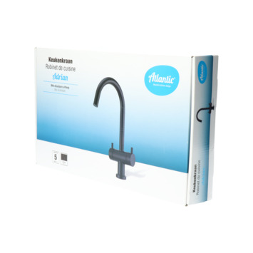 De Atlantic keukenkraan Adrian 2-knops Zwart bestaat uit een mat zwarte keukenkraan van 33,5 cm hoog met 2 flexibele aansluitslangen, bevestigingsmateriaal en montagehandleiding. De Adrian keukenkraan heeft een draaibare uitloop van 360° waarmee je eenvoudig plaats maakt bij je gootsteen. Met de 2 draaiknoppen kies je hoeveel warm of koud water je wil gebruiken. Aan de anti-kalk perlator hecht kalk zich moeilijk vast en veeg je er makkelijk met de hand af. Deze modern vormgegeven kraan heeft een mat zwarte afwerking en ziet er daardoor robuust uit. Gebruik alleen water en een zachte doek om de kraan schoon te maken. Gebruik geen schurend, bijtend, azijnhoudend of agressief schoonmaakmiddel. Besluit je de kraan te kopen? Dan heb je 5 jaar garantie.