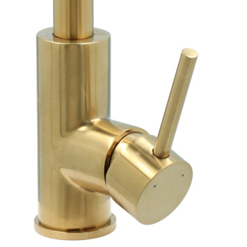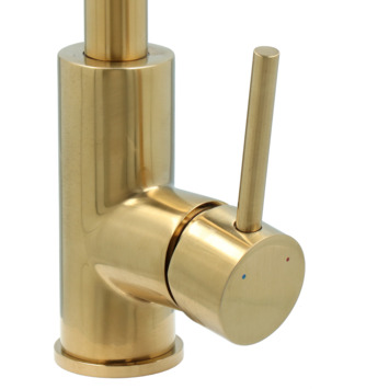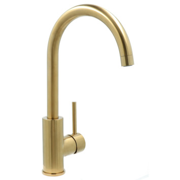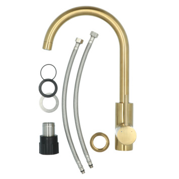 De Atlantic keukenkraan Colin met hendel Messing bestaat uit een geborstelde goudkleurige messing keukenkraan van 35,7 cm met 2 flexibele aansluitslangen, bevestigingsmateriaal en montagehandleiding. De Colin keukenkraan heeft een handige draaibare uitloop van 360° waarmee je eenvoudig plaats maakt bij je gootsteen. Met de eenhendelbediening draai je snel met 1 hand de kraan naar de gewenste temperatuur. Je bespaart water door de ingebouwde eco-klik. Deze ingebouwde weerstand in de hendel zorgt ervoor dat je de kraan niet direct op de hoogste straalstand zet. Wens je toch een hardere straal, dan zet je de hendel gewoon verder open. Aan de anti-kalk perlator hecht kalk zich moeilijk vast en veeg je er makkelijk met de hand af. Deze keukenkraan heeft een mooie geborstelde goudkleurige messing afwerking. Gebruik alleen water en een zachte doek om de kraan schoon te maken. Gebruik geen schurend, bijtend, azijnhoudend of agressief schoonmaakmiddel. Besluit je deze kraan te kopen? Dan heb je 5 jaar garantie.